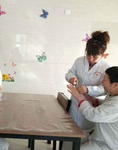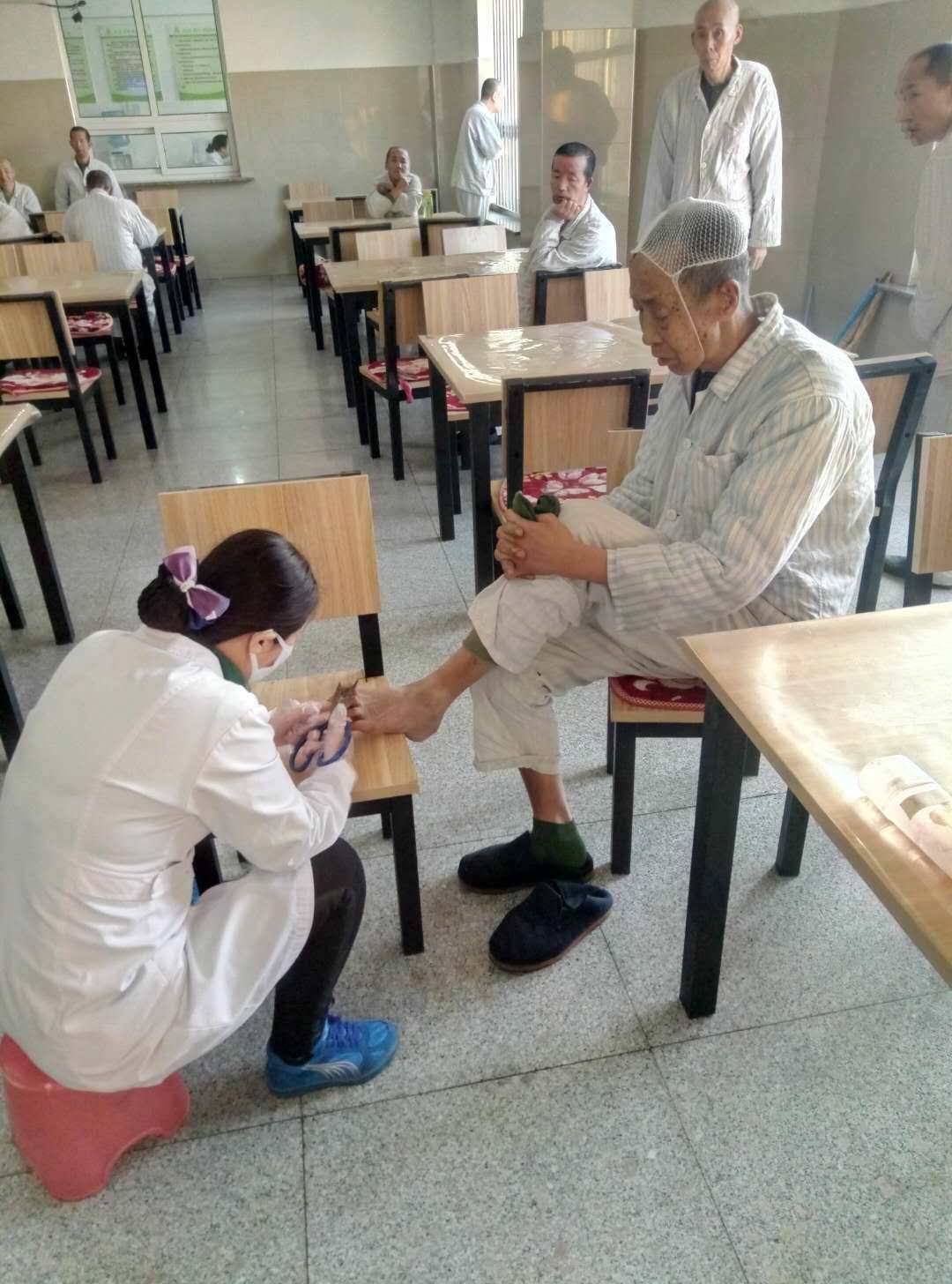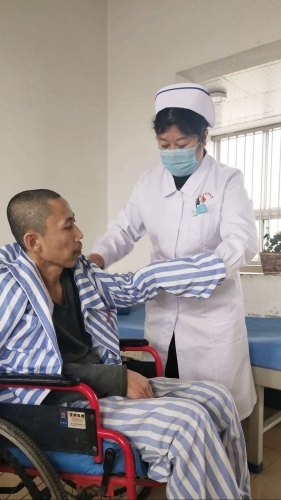 因患腰椎间盘突出症在家休息的老护士长王桂荣,拖着病弱的身体步行1个多小时来到廖区指导工作。